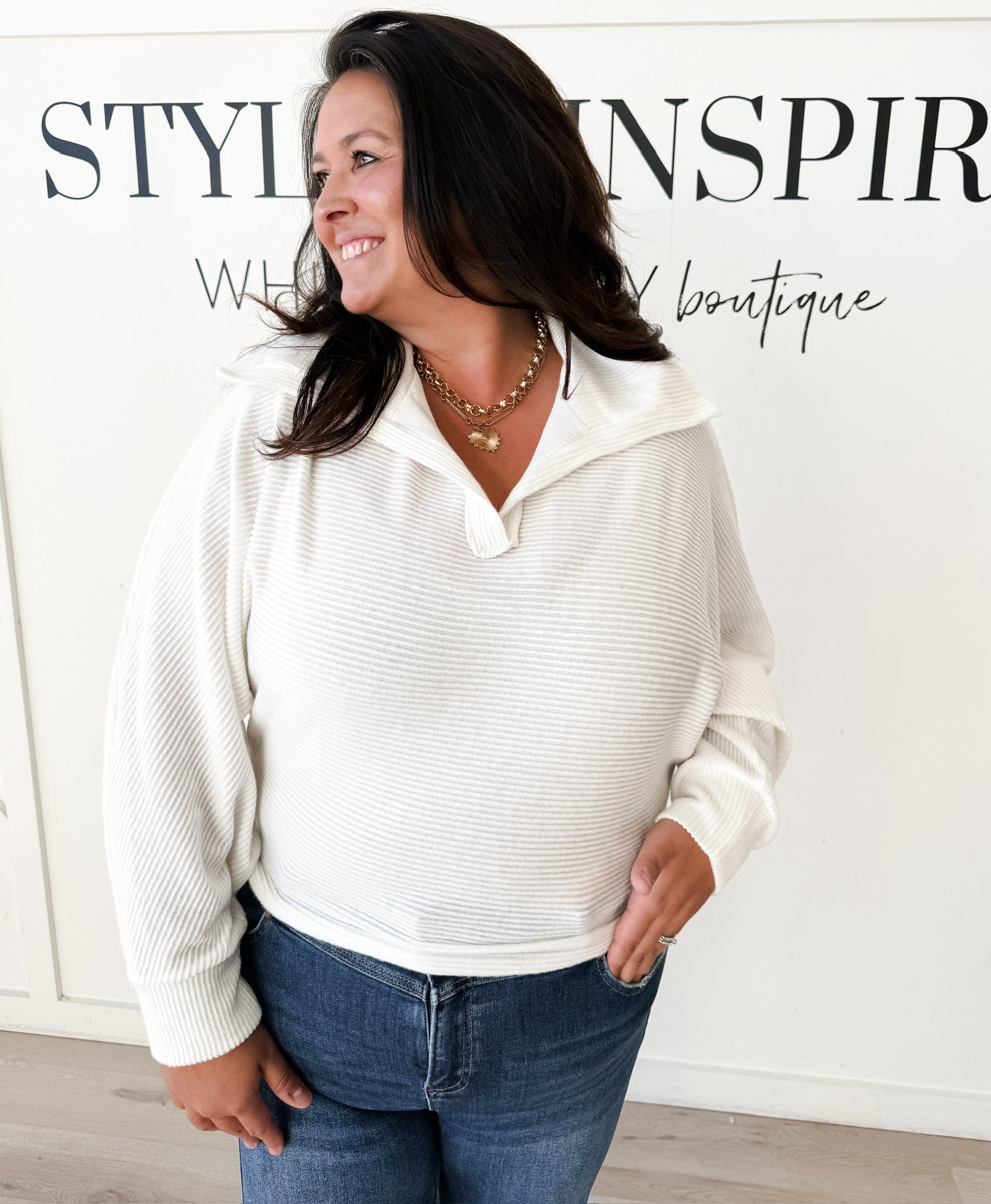 Style: The Nicole Split V Collared Top features a wide collar and a distinctive split V front that adds a modern touch to its classic silhouette. Crafted from a soft brushed knit, this long-sleeve top offers exceptional comfort and subtle texture thanks to its horizontal ribbing. Ideal for layering or wearing alone, it combines refined style with cozy wearability for versatile everyday elegance.
