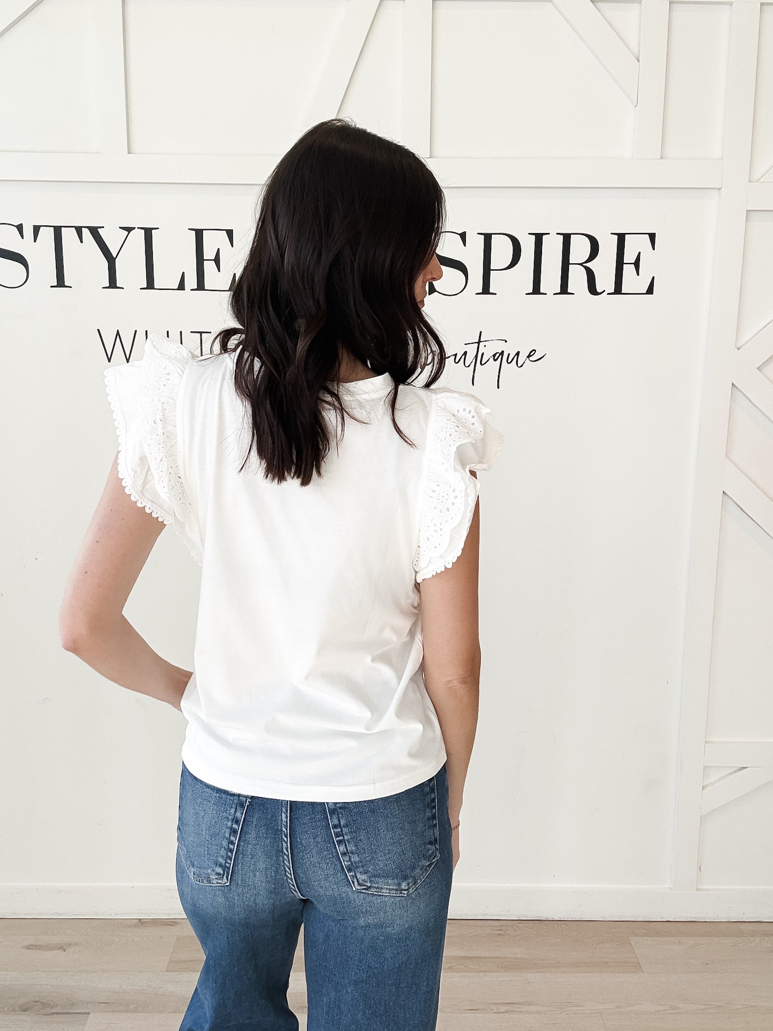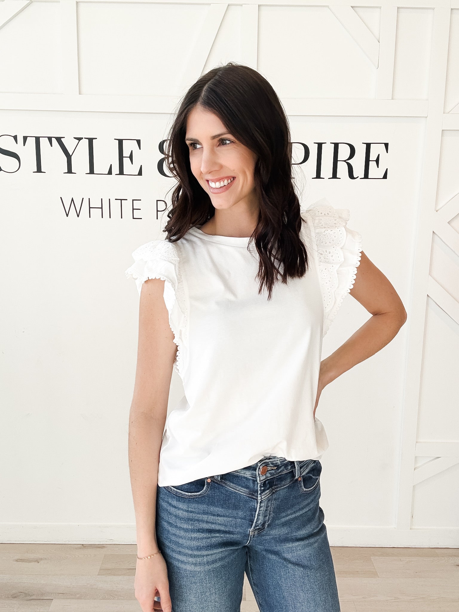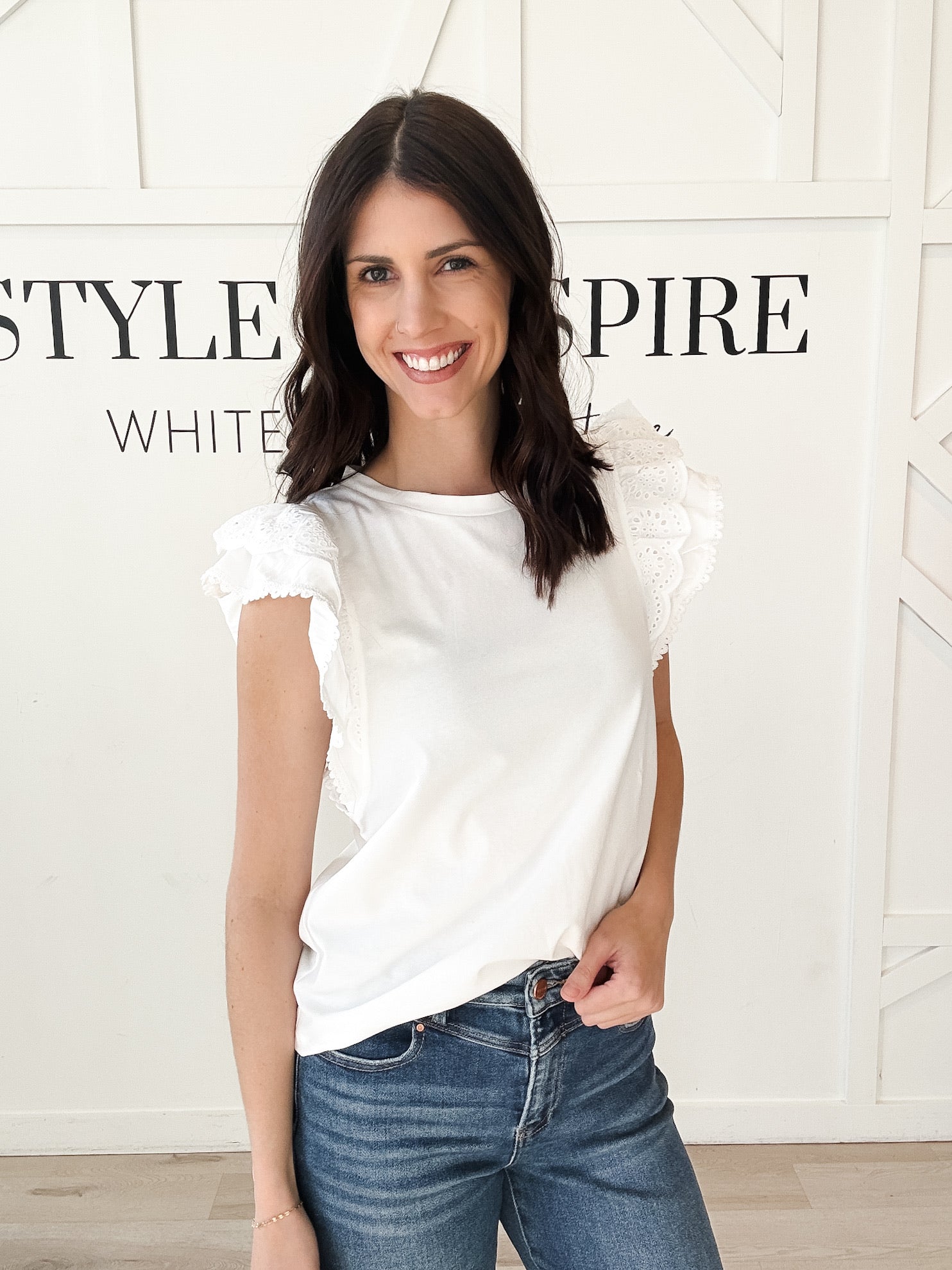 The standout feature is the double flutter sleeves, finished with intricate lace detailing that adds movement and a soft, romantic feel. A classic crew neckline and straight hem keep the silhouette clean and versatile, making it easy to dress up or down with your favorite bottoms.