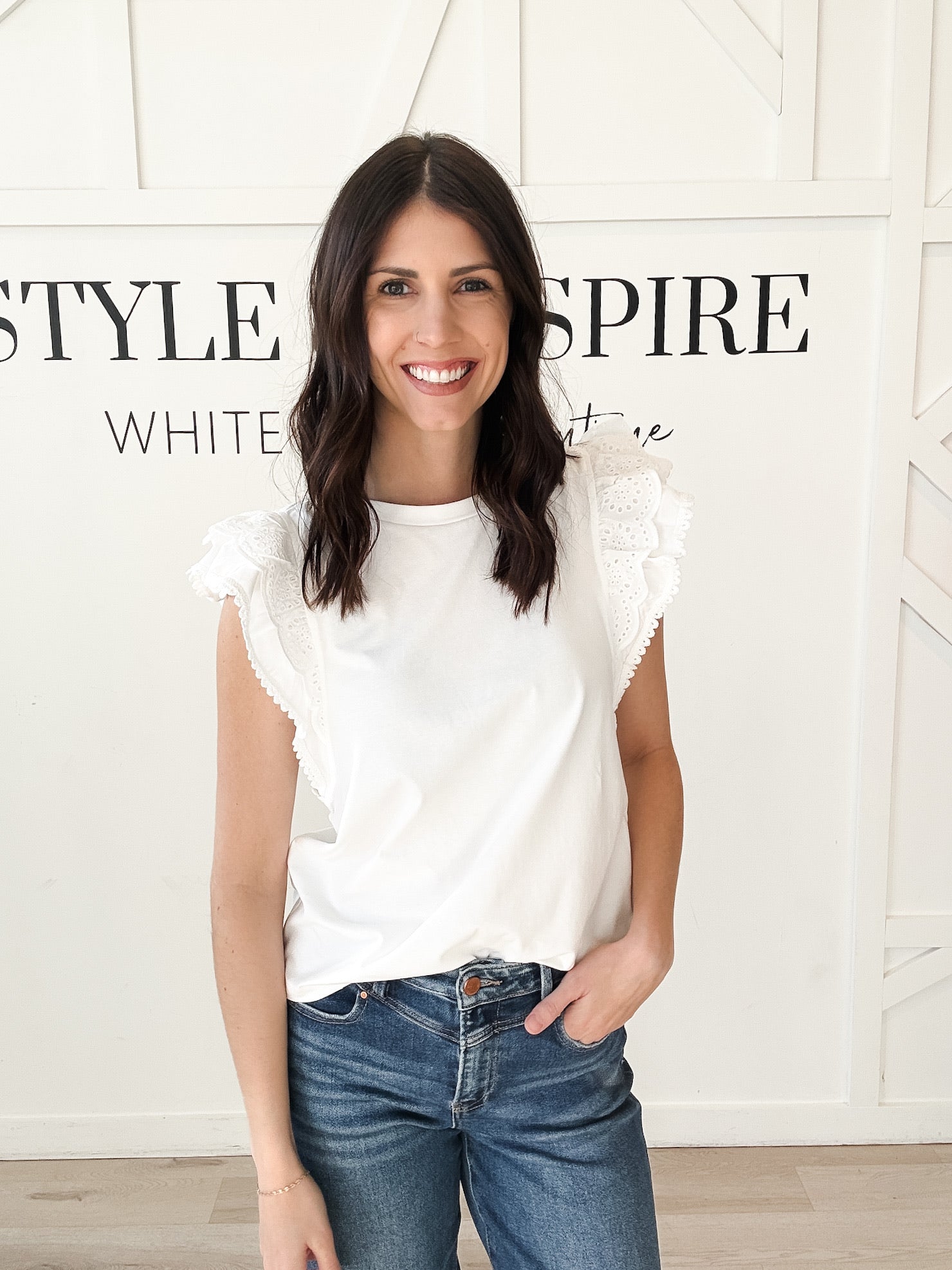 The lace flutter sleeves are absolutely stunning — they add just the right amount of feminine detail while still keeping this top easy and wearable for everyday.