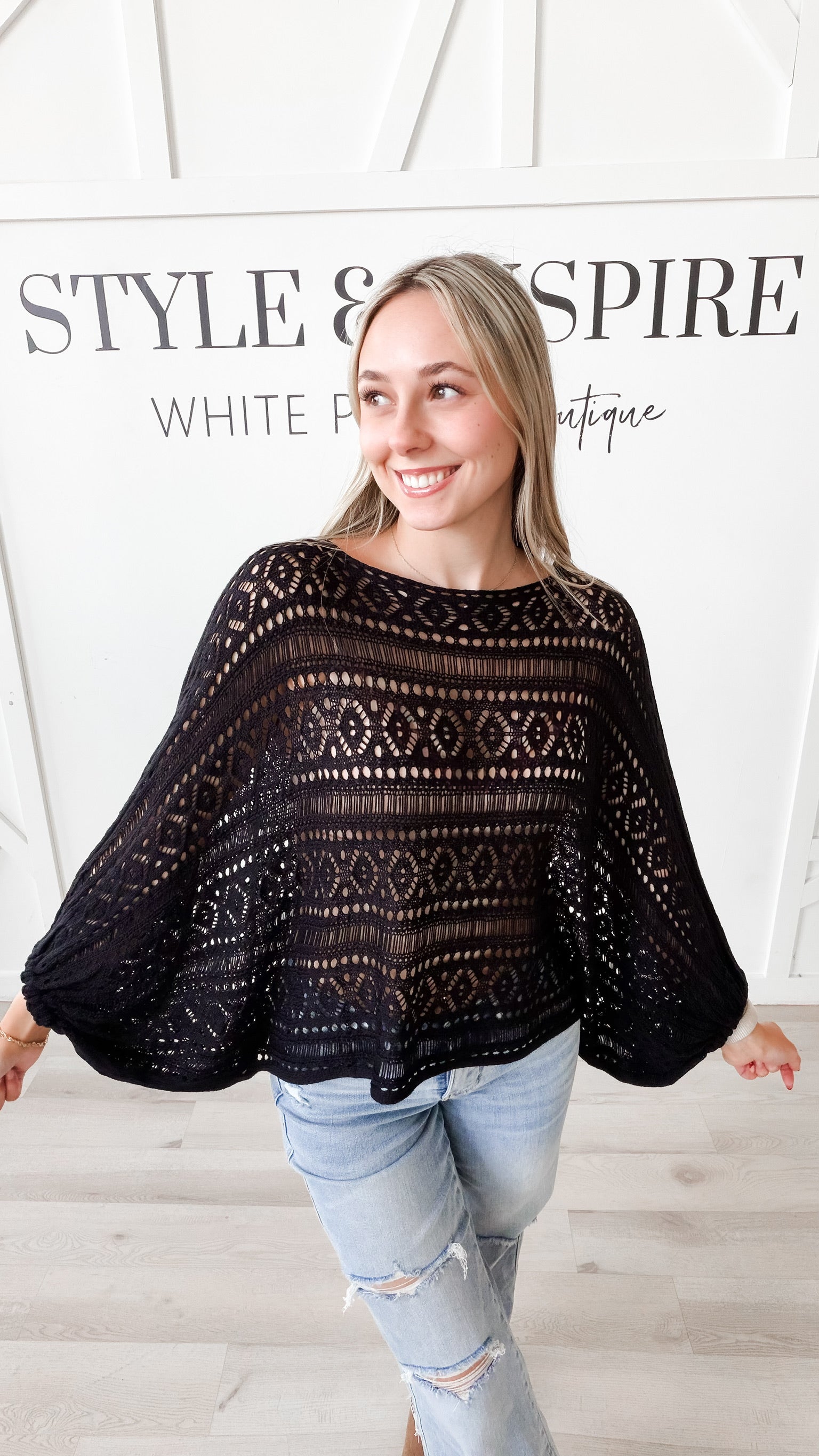 Style: Raegan Open Knit Dolman Sleeve Top Crafted with a striking tribal open knit pattern, this top delivers effortless sophistication through thoughtful design details. The boatneck neckline and relaxed boxy silhouette create a flattering, contemporary fit, while dolman sleeves offer graceful movement and visual interest. Elastic arm cuffs provide subtle structure without compromising comfort. The open knit construction allows for breathability and layering versatility, making this piece an ideal transitional piece for any wardrobe. Perfect for those seeking understated elegance with modern appeal.