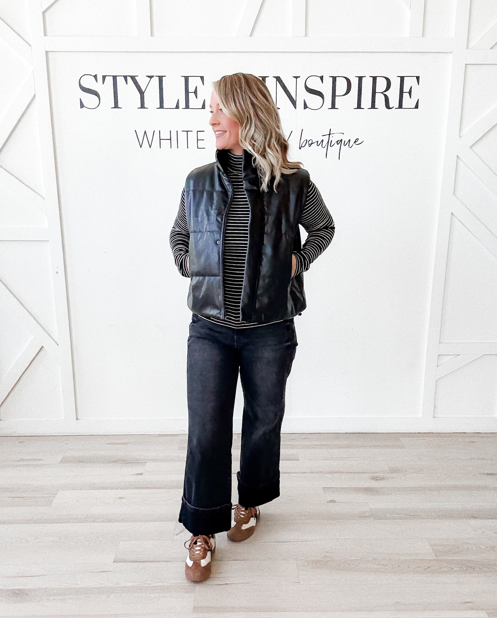 Style: The Trudy Quilted Faux Leather Vest features a cozy polar collar and a front zipper with snap closure for secure wear. Designed without sleeves for layering versatility, it includes convenient side pockets. The quilted construction enhances warmth while maintaining a sleek silhouette, crafted in durable faux leather for a stylish and animal-friendly finish. Ideal for adding textured interest and lightweight insulation to any outfit.