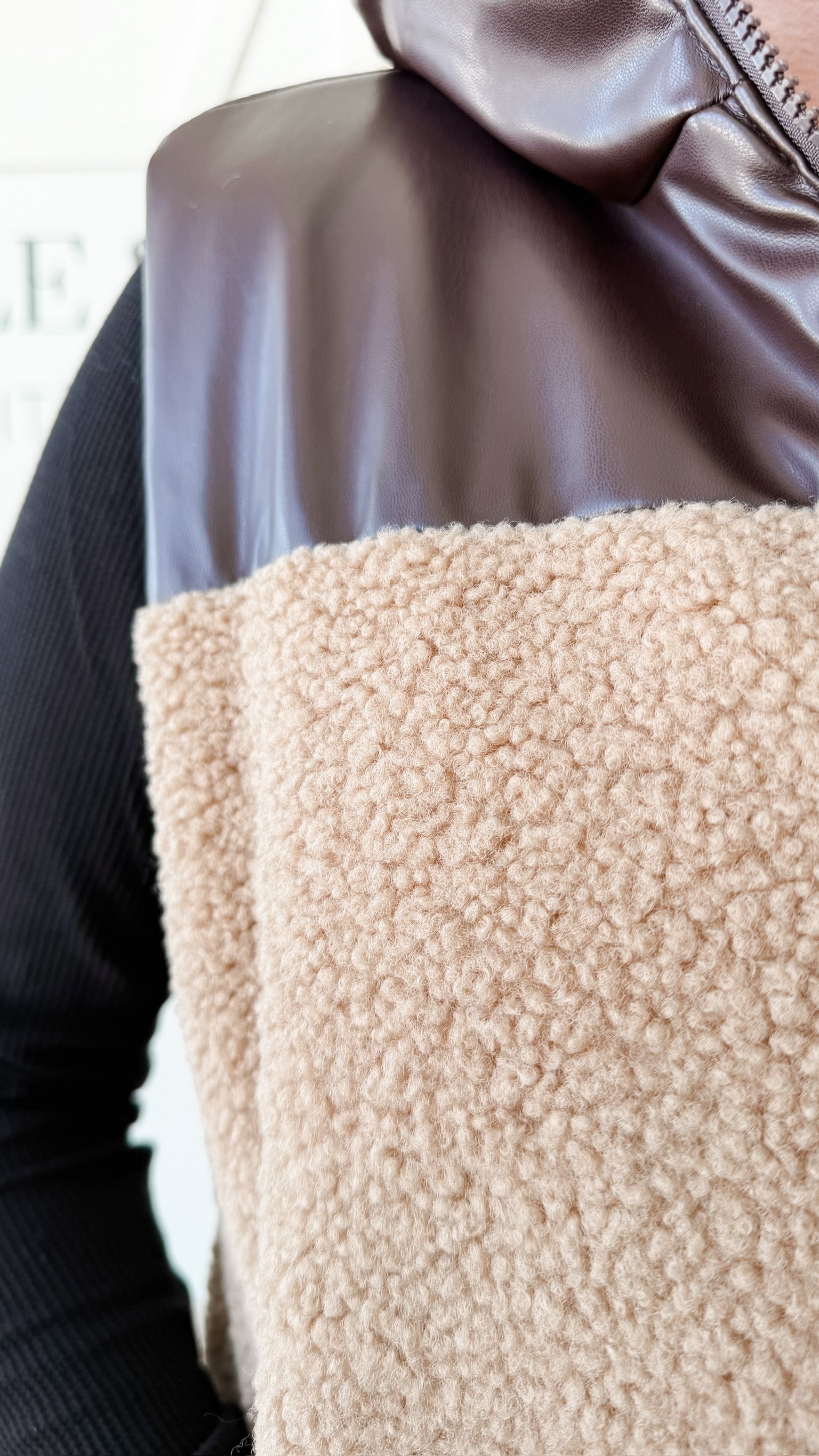 Style: Katheryn Reversible Faux Leather Sherpa Crop Vest Engineered for versatility, this reversible vest transitions effortlessly between polished and casual aesthetics. The faux leather side pairs with cozy sherpa for two distinct looks in one piece, while the cropped silhouette flatters modern proportions. A structured polar collar frames the neckline, and the front zip closure allows for layered styling flexibility. Sleeveless construction makes it ideal for layering across seasons, and functional side hand pockets add practical appeal. A sophisticated wardrobe essential that adapts to your lifestyle.