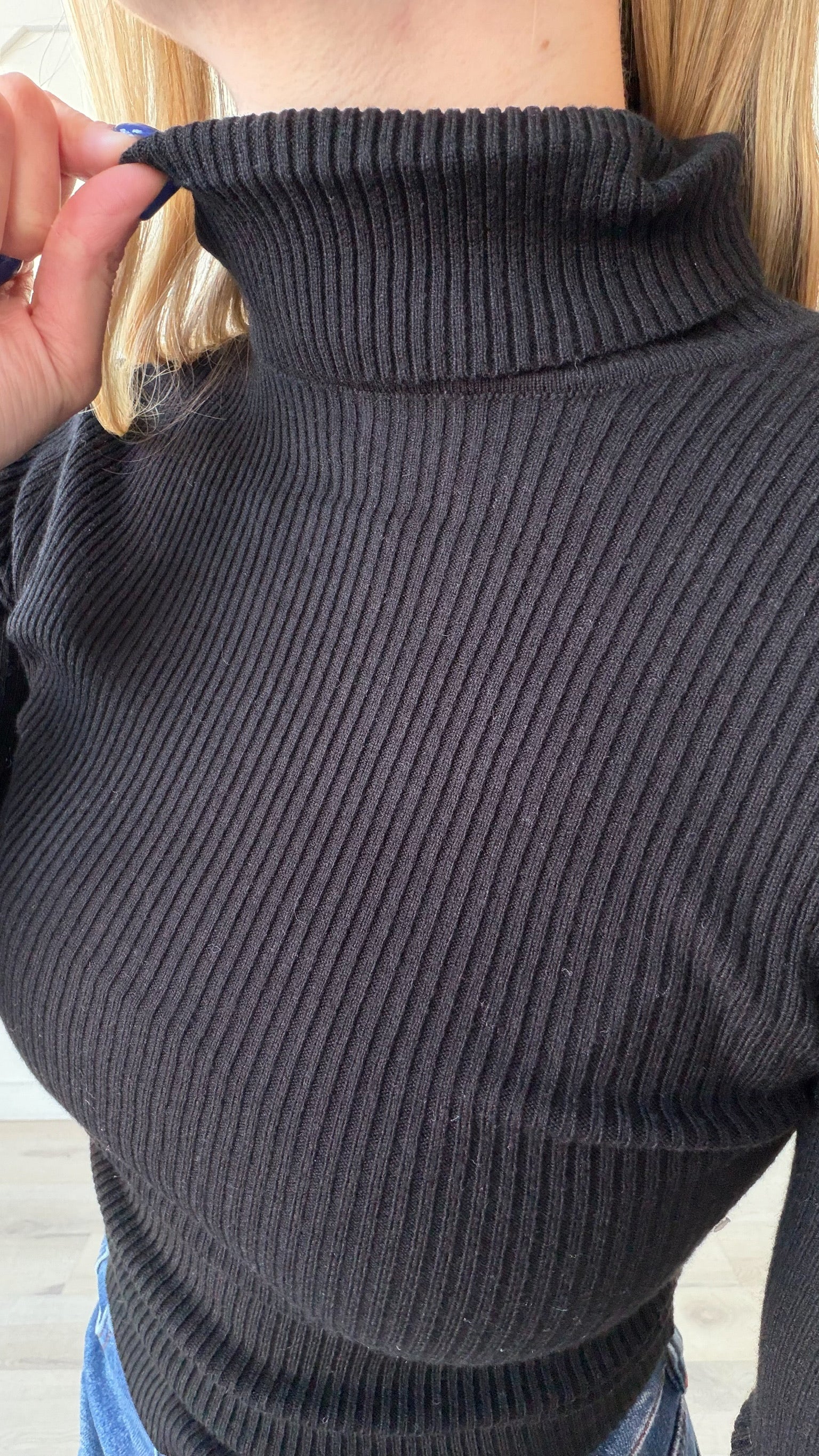 Fit: Turtleneck. Long sleeves. Form fitting. Ribbed knit.
