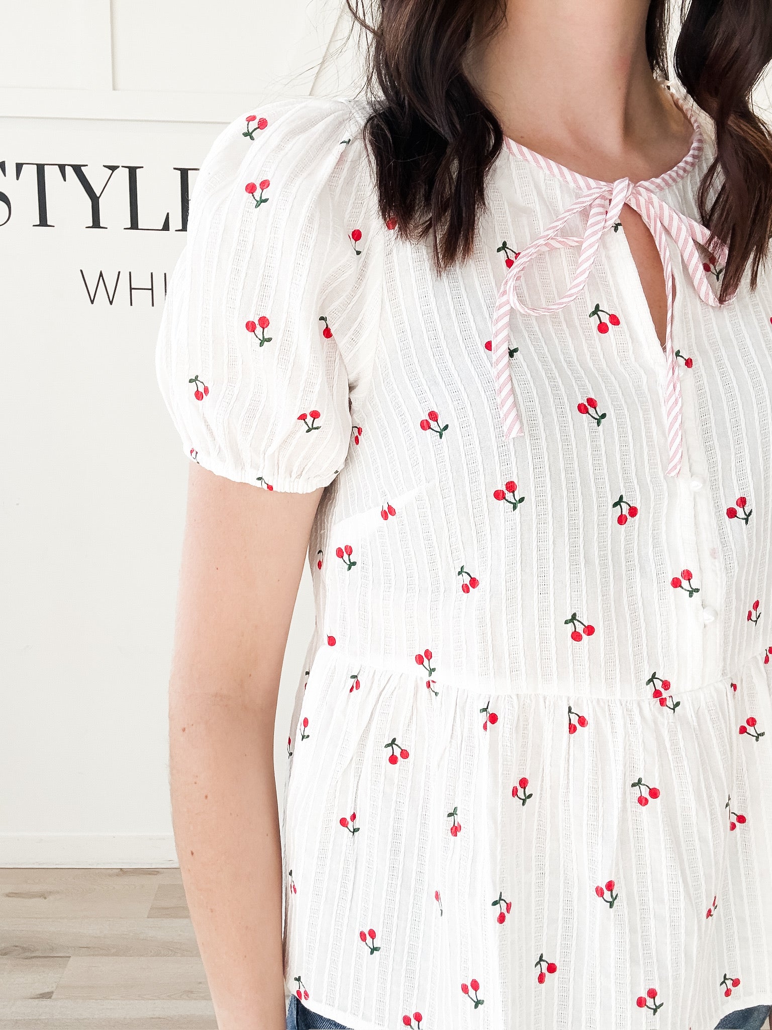 This top is sweet, playful, and beautifully feminine. The cherry print and peplum shape make it a standout piece that feels both fun and flattering.
