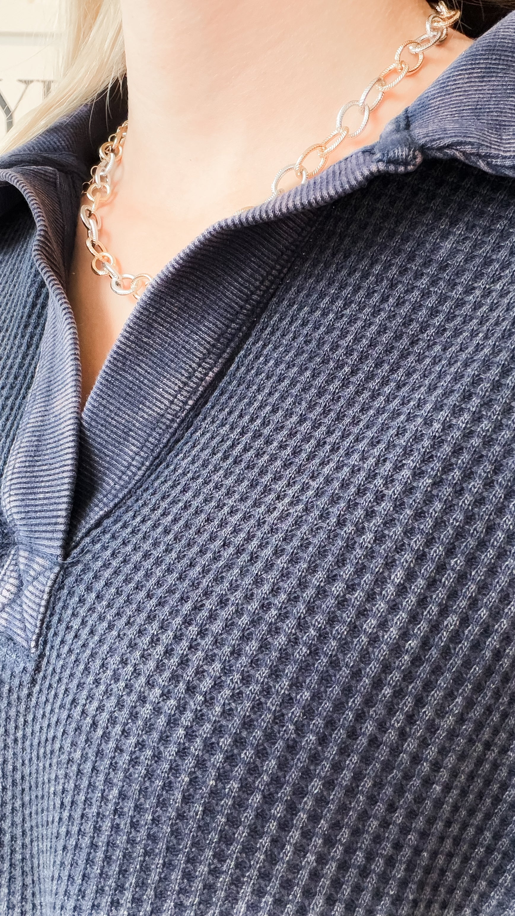 Style: The Sharon Washed Thermal Top features a shirt collar with a distinctive split V front, enhanced by contrast ribbing on the neckline and cuffs for subtle detailing. Crafted from soft waffle knit fabric, this top offers comfortable breathability and texture. Its straight hem with side slits provides ease of movement and a tailored finish, making it a versatile layering piece for refined casual wear.