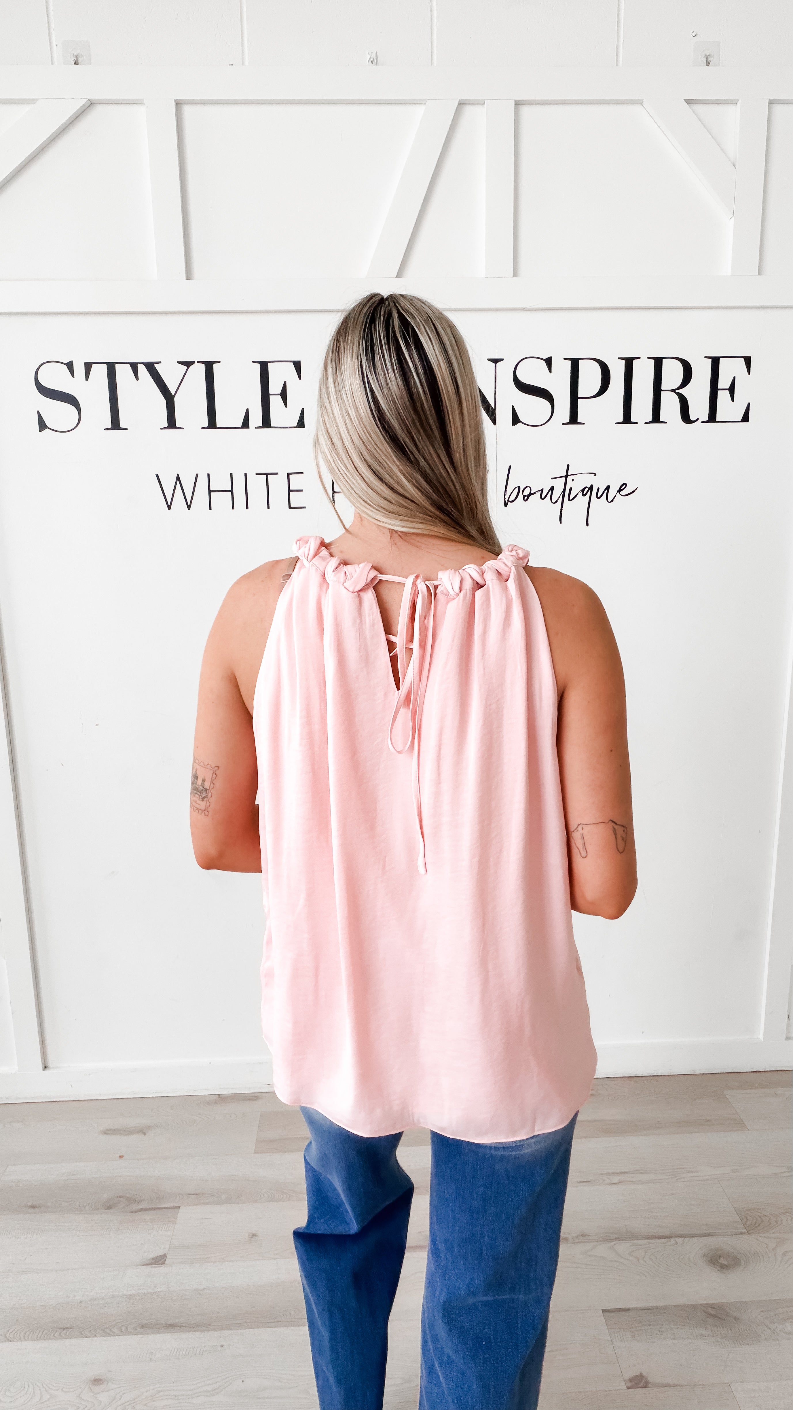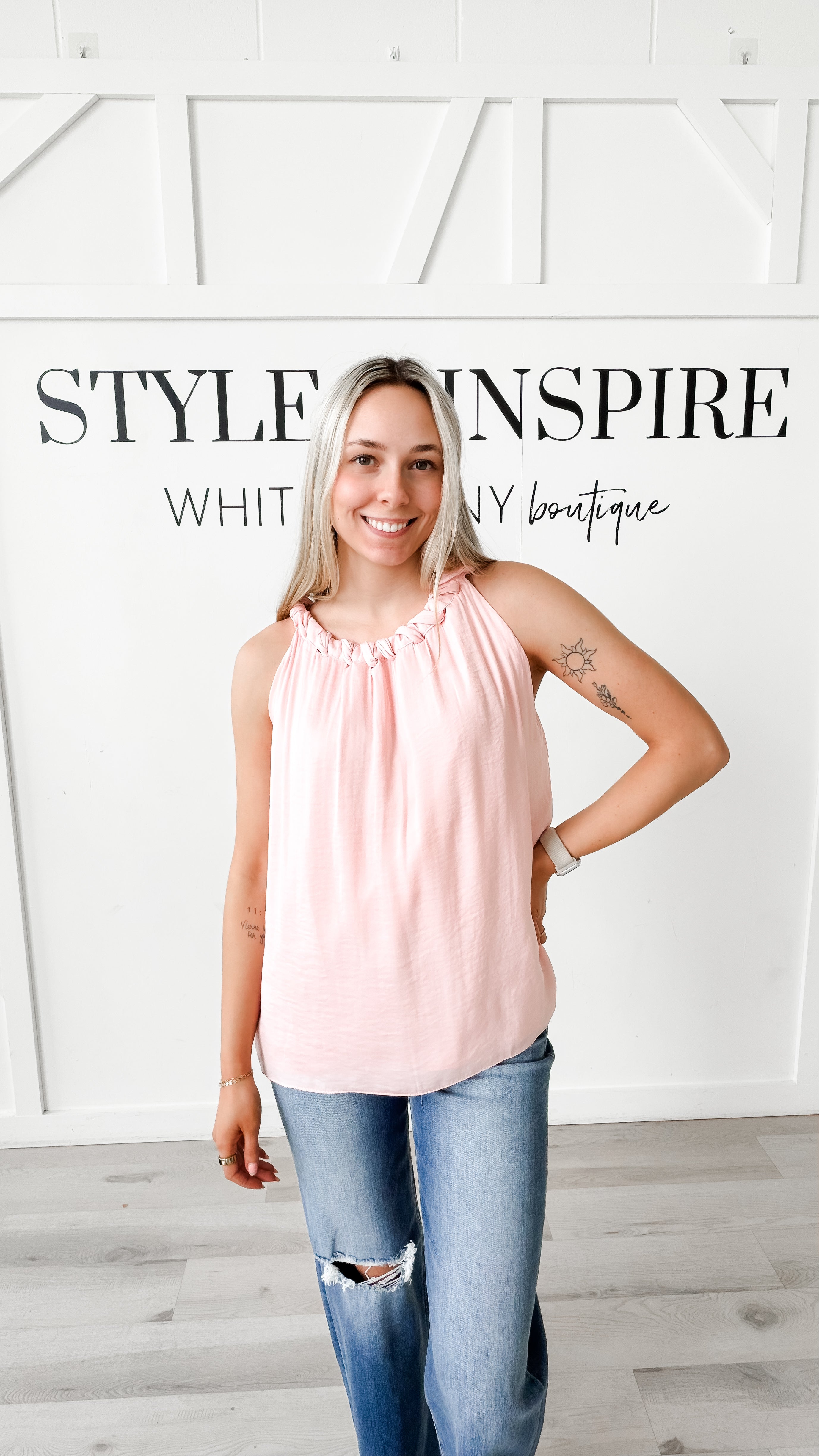Style: The Addison Twisted Halter Top features a distinctive twisted halter neckline that creates an elegant, sculpted silhouette. Crafted from lightweight woven fabric, this sleeveless piece drapes beautifully with an airy, fluid movement. The adjustable self-tie back allows for a customized fit, making it versatile for various body types and styling preferences. Perfect for warm-weather layering or as a standalone piece, this top combines contemporary design with practical comfort.