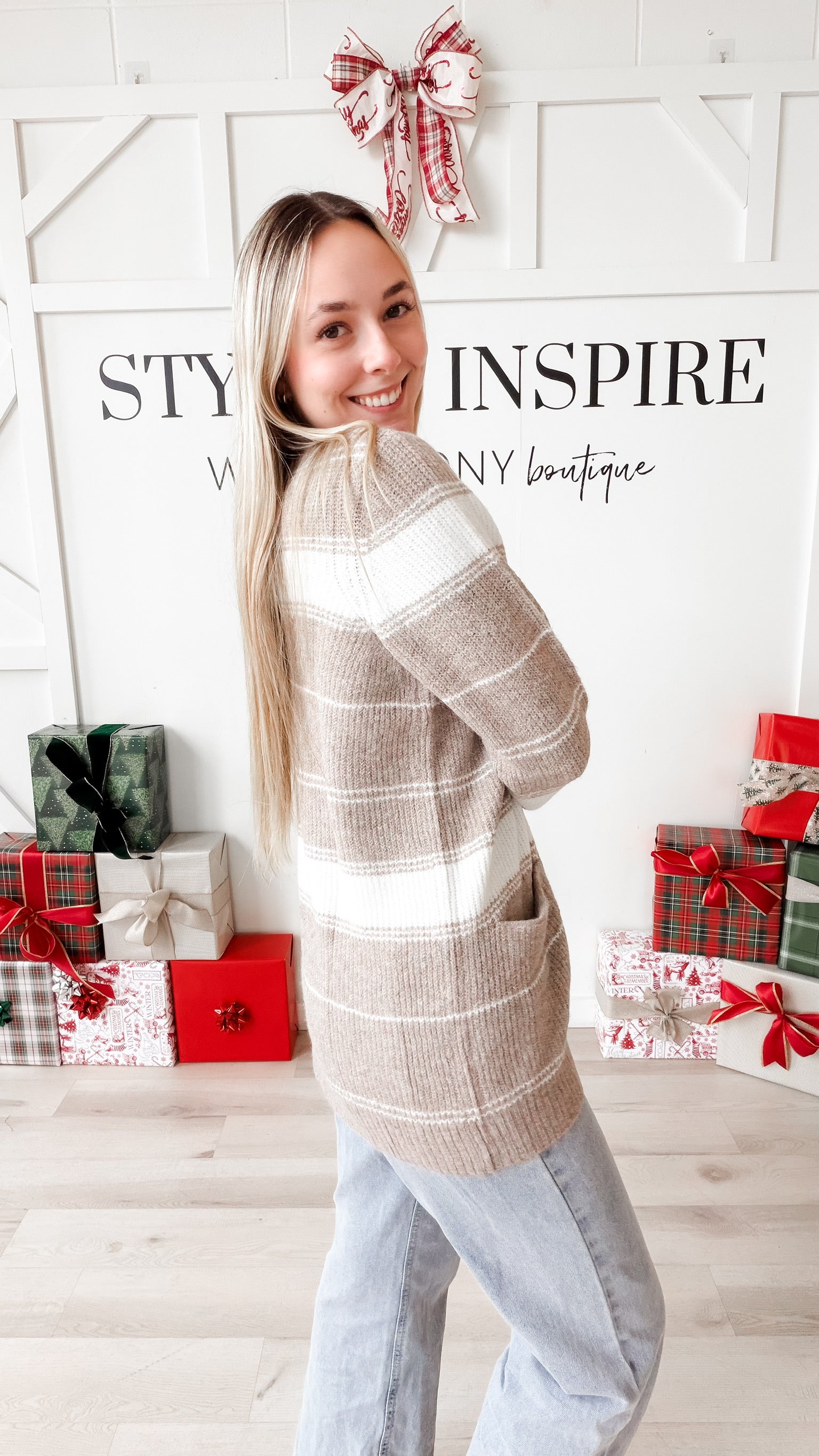 Style: The Angela cardigan combines effortless sophistication with everyday comfort. Featuring a relaxed long line silhouette and open front design, it layers beautifully over any outfit. Long sleeves with contrast ribbing add refined detail, while functional front patch pockets offer practical style. Variegated stripes create visual interest across the piece, and the super soft, lightweight fabric makes it ideal for layering without bulk. A versatile essential that transitions seamlessly from season to season.