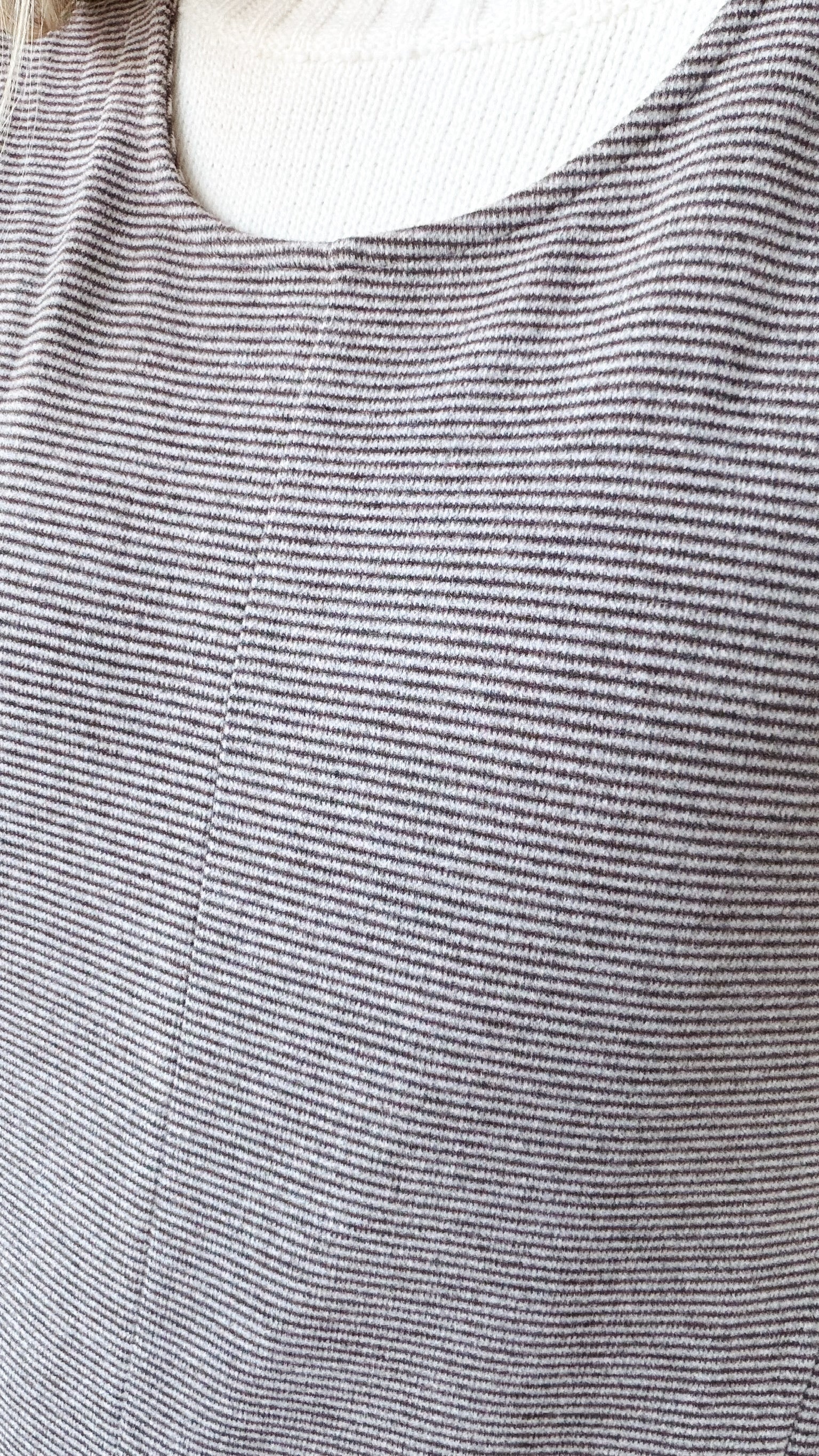 Fit: Inseam 31 1/2". Scoop neck. Sleeveless. Self tie side ribbon at waist. Relaxed wide leg. Subtle stripe pattern. Ultra soft and light weight.