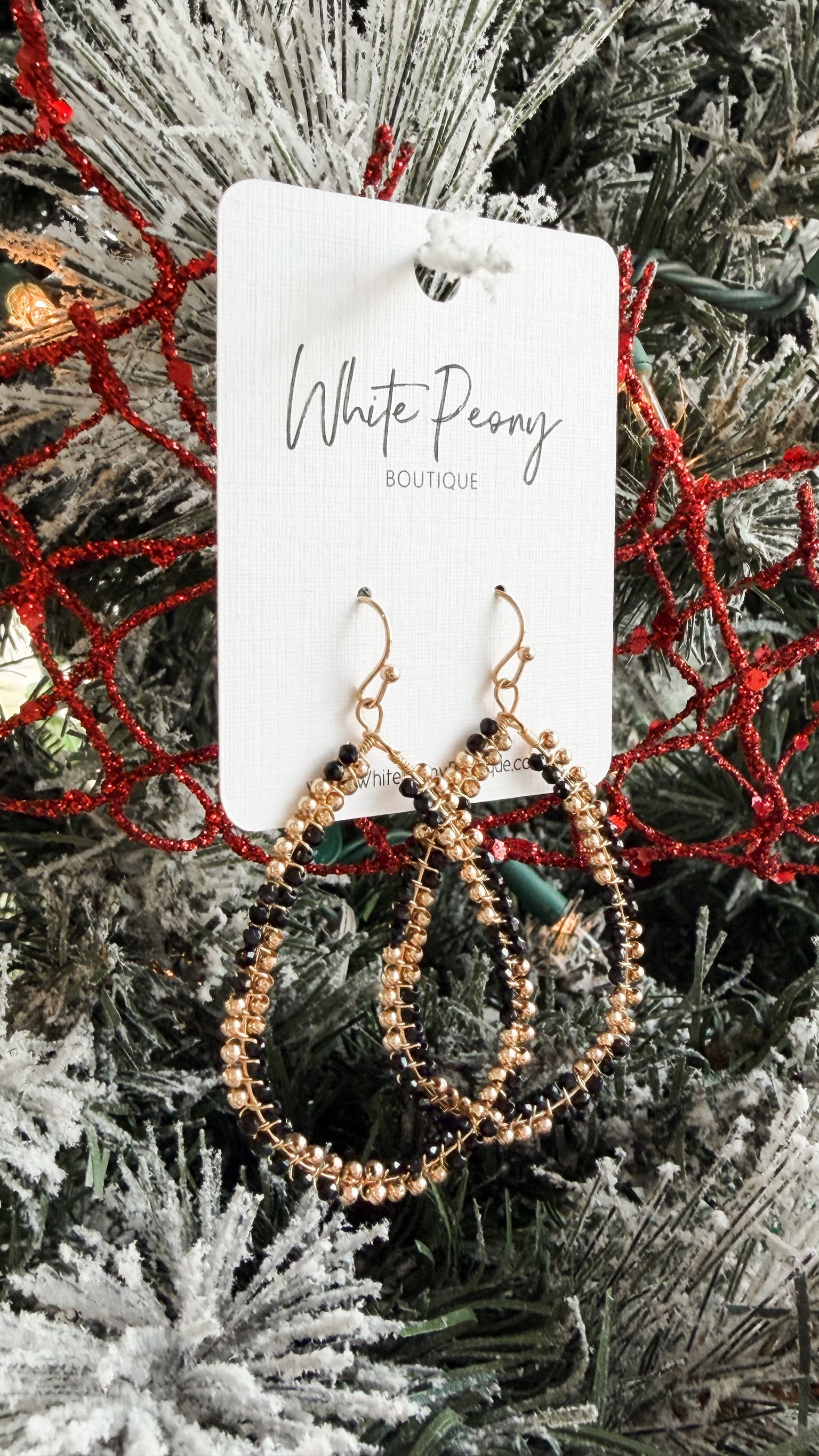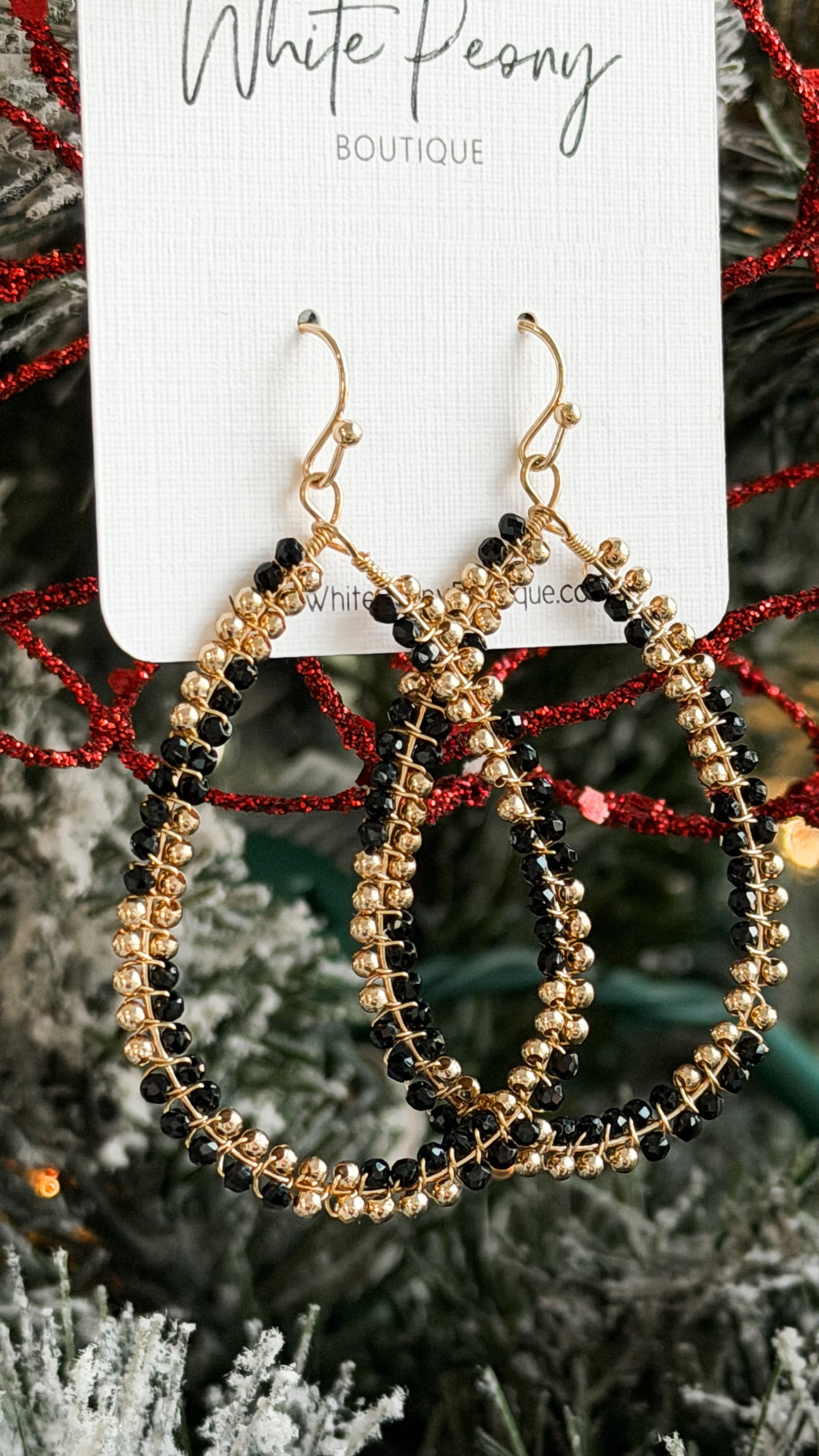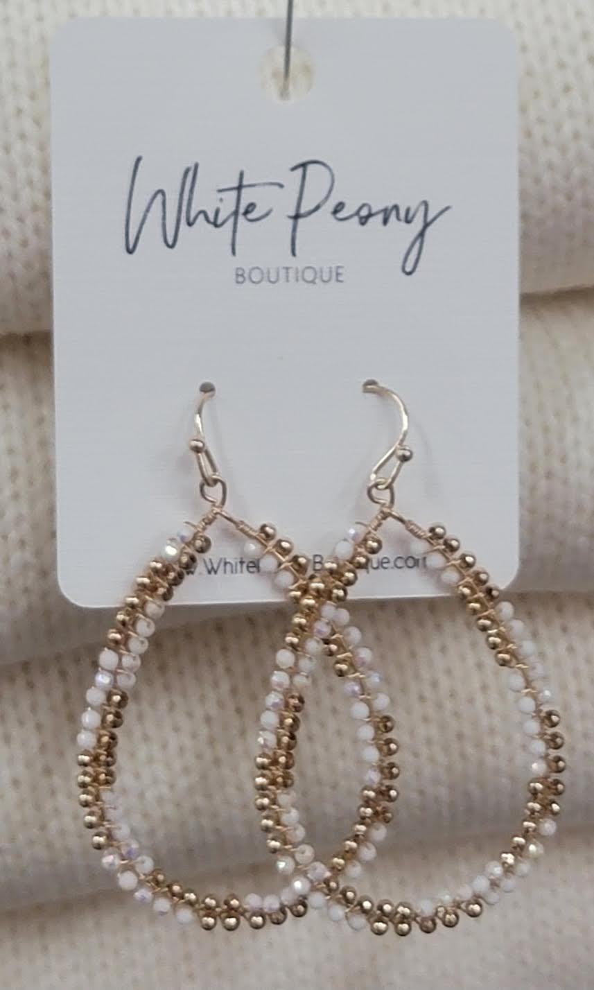 Elegant and versatile, these teardrop earrings feature shimmering metallic and faceted beads woven together in a soft loop design. Available in ivory or black, each pair adds a touch of subtle sparkle that complements both day and evening looks. Lightweight and comfortable for all-day wear.