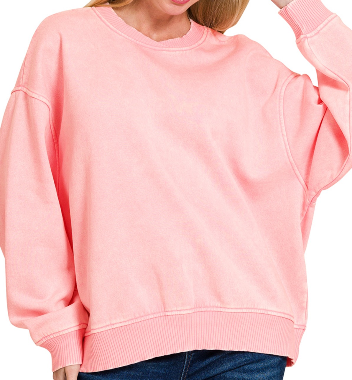 Fit: Crewneck. Drop shoulders. Long sleeves. Contrast ribbing on the neck, cuffs and hem. Super soft. Acid wash coloring. Oversized.