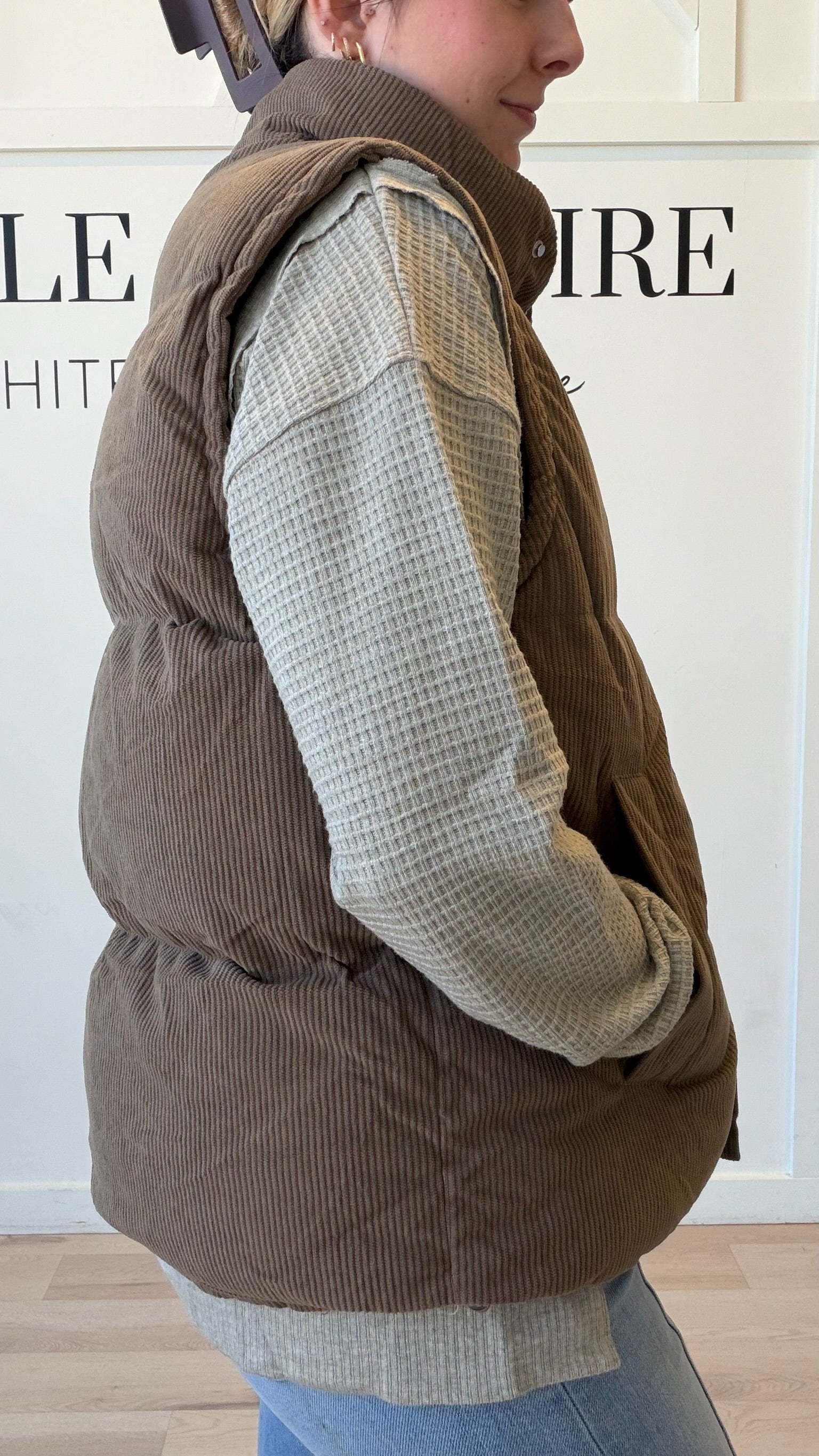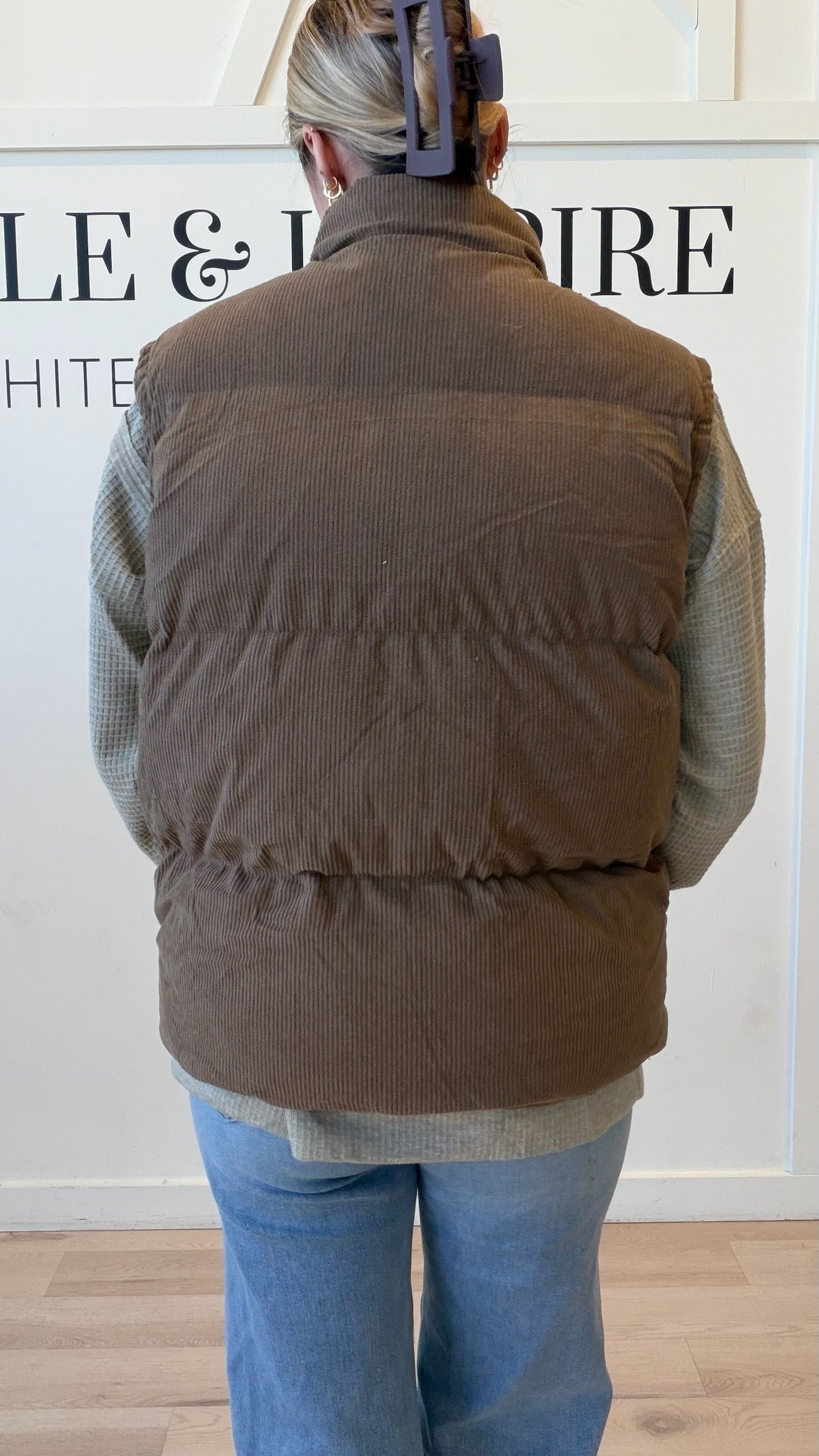 Style: The Nanette Corduroy Puffer Vest features a stand-up polar collar for added warmth and protection. Its zip and snap front closure ensures secure layering, while the sleeveless design offers freedom of movement. Crafted with a corduroy quilted puffer texture, this vest combines style with insulation. Convenient side hand pockets provide practical storage, and the drawstring hem allows for an adjustable fit to block out the cold. Perfect as a versatile layering piece for cooler days.