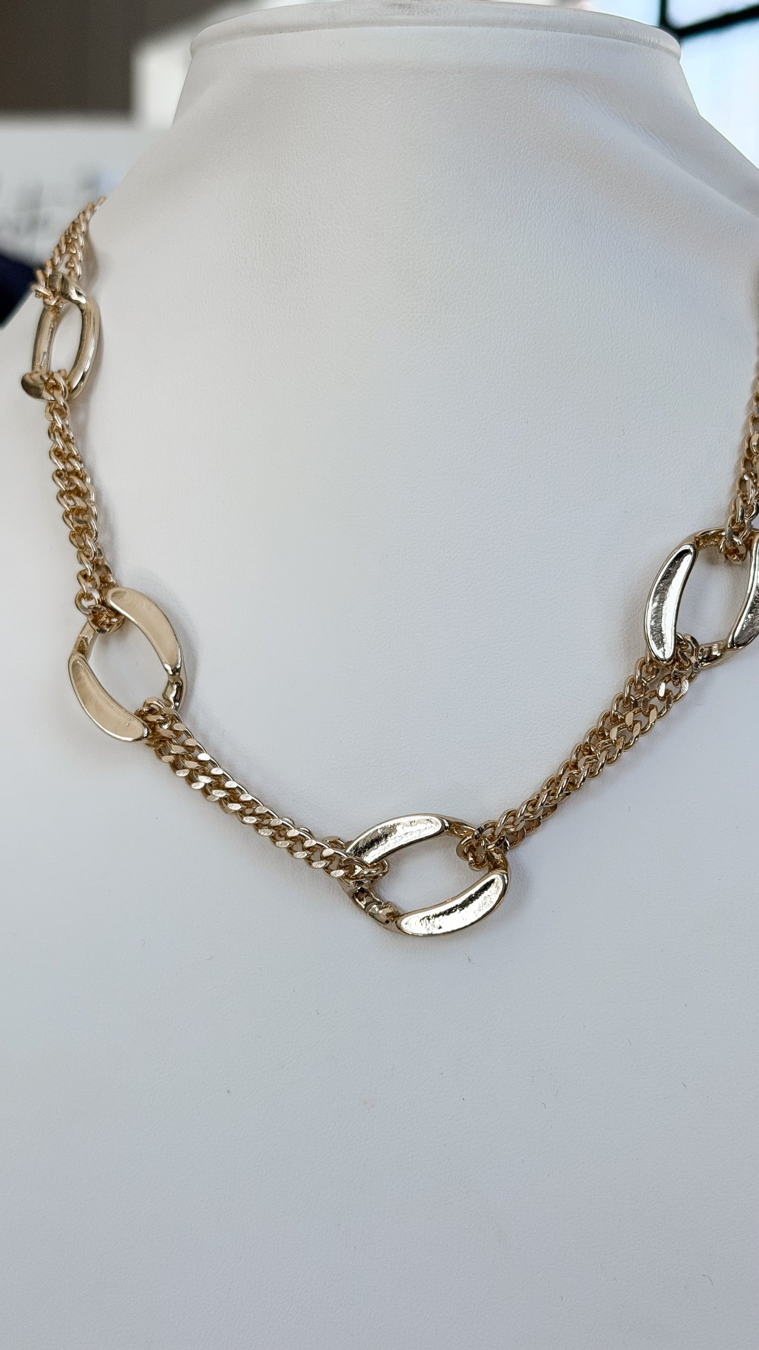 Modern and effortlessly stylish, the Open Circle Necklace is a sleek statement piece with a contemporary edge. This necklace features polished open gold circles connected by layered chain links, creating a bold yet balanced design that adds texture and movement.