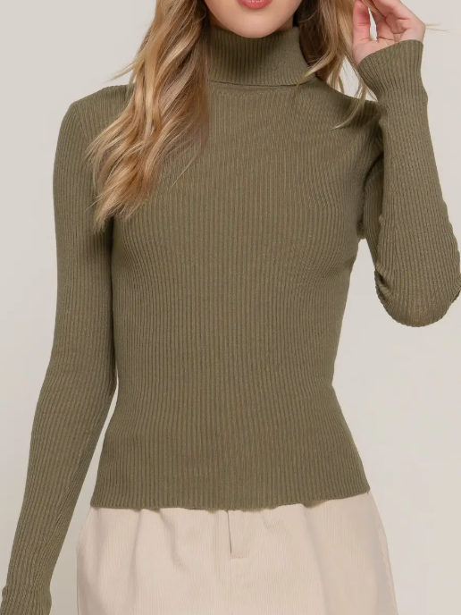 Fit: Turtleneck. Long sleeves. Form fitting. Ribbed knit.