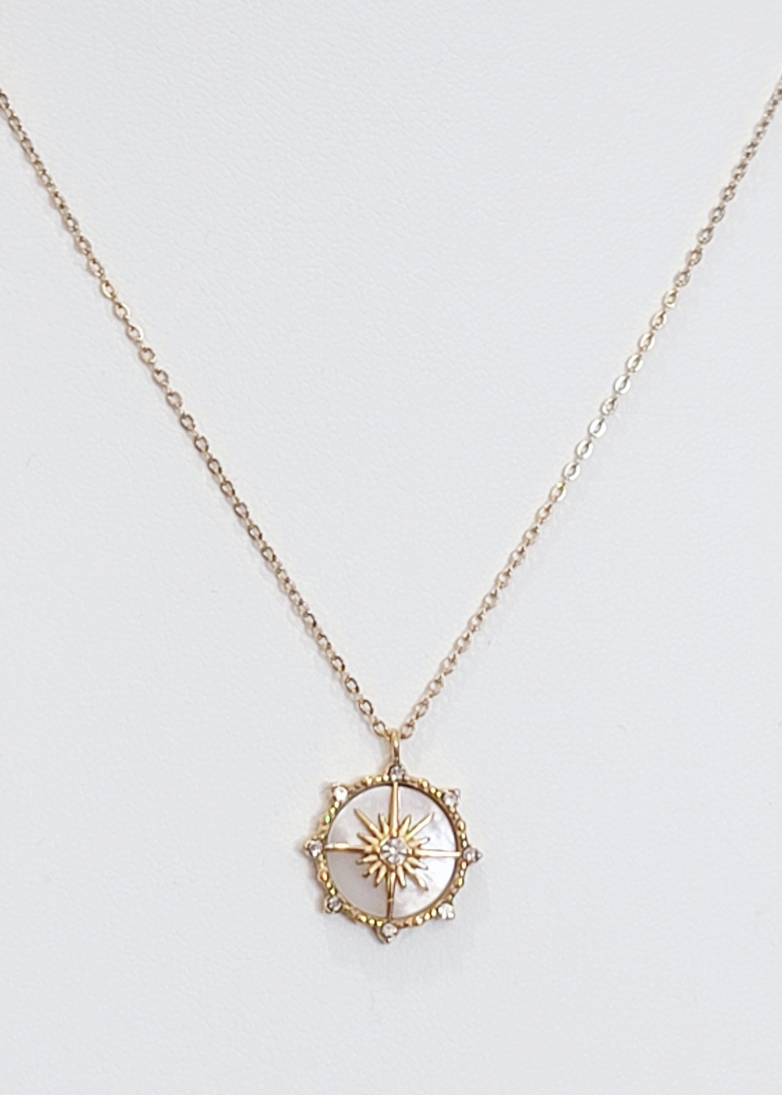 A celestial-inspired pendant necklace featuring a luminous shell backdrop crowned with a radiant gold starburst and crystal center.